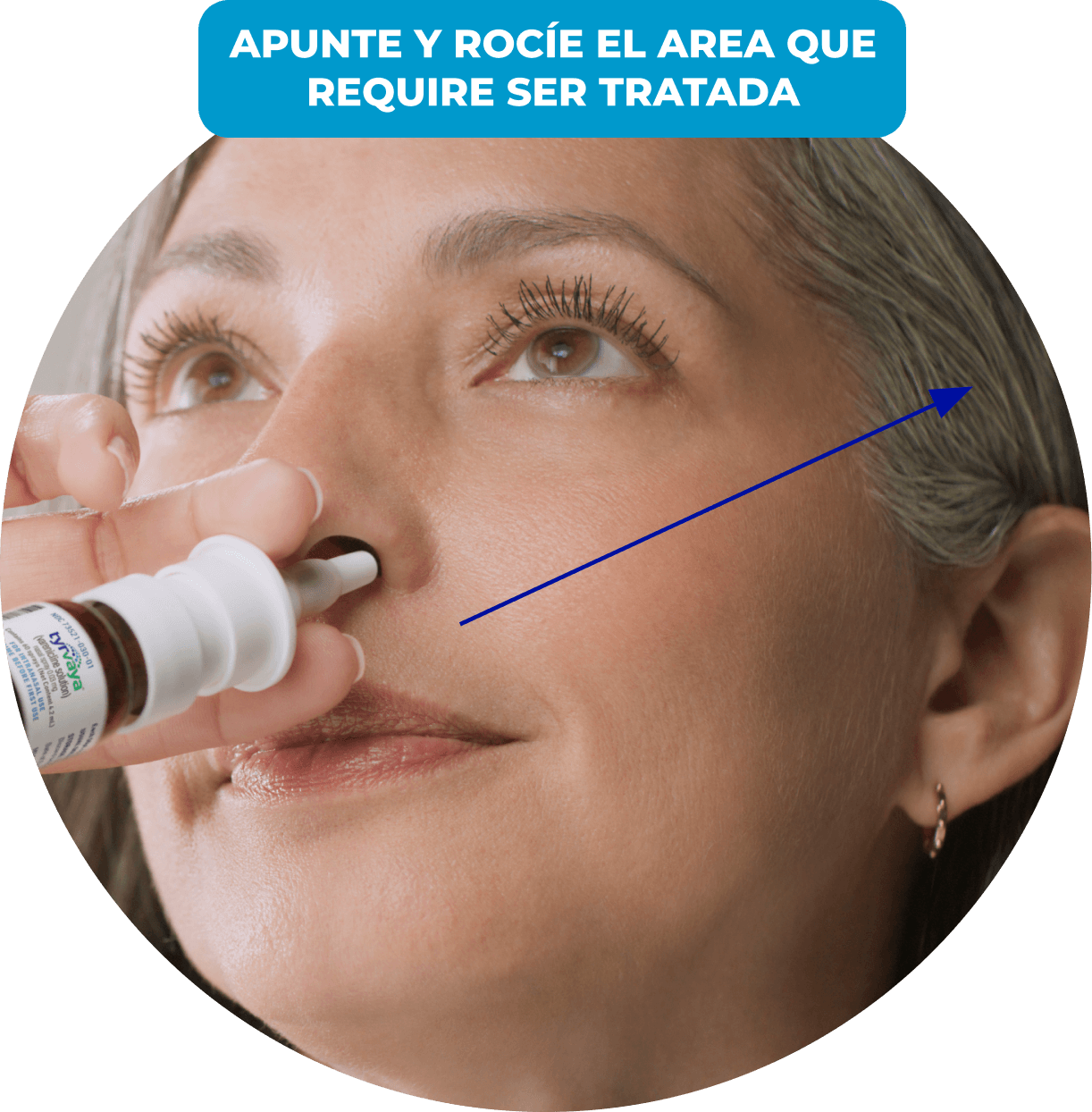Respire suavemente mientras presiona hacia abajo por completo y libera el aplicador, y rocíe el interior de su orificio nasal. El medicamento se absorberá en la pared de la nariz, donde está ubicado el nervio que se pretende tratar.
