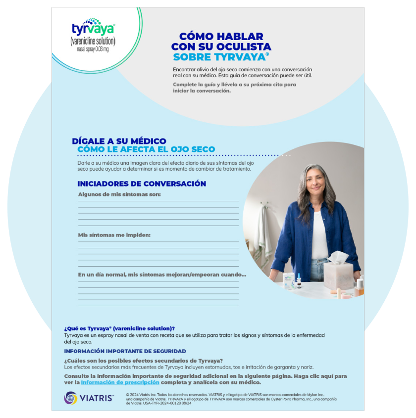 A fin de obtener ayuda para hablar con su médico sobre sus síntomas de ojo seco o ver si Tyrvaya podría ser adecuado para usted, descargue nuestra guía de conversación con los médicos a continuación.